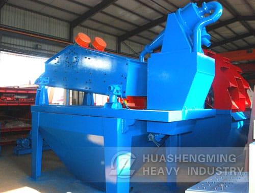 The compound of sand and water is transported to the cyclone by pump, and the fine sand after centrifugal classification concentration is provided to the vibrating screen by the grit setting mouth, after vibrating screen dewater, the fine sand and water are effectively separated. Through the recycling box, little fine sand and mud return again to the rinse tank, and then they are exhausted from the discharge hole when the rinse tank liquid level is too high. The material weight concentration recovered by the linear vibrating screen is 70%-85%. Adjusting the fineness module can be realized by changing the pump rotating speed and pulp concentration, regulating the overflow water yield and replacing the grit mouth, thus achieves its three functions—washing, dewater and classification.