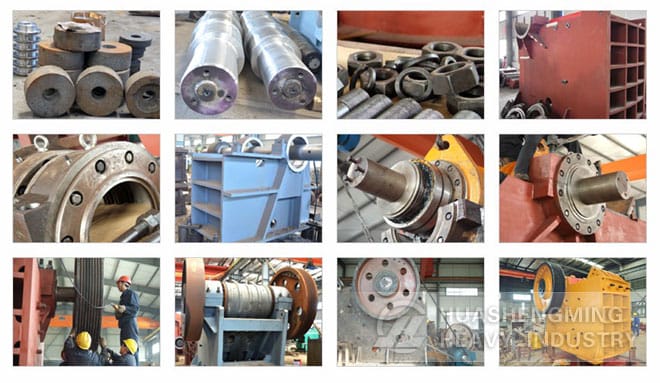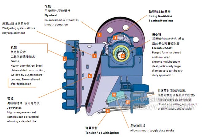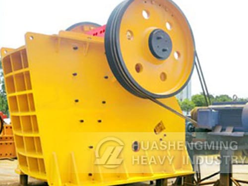 The motor drives the belts and the belt wheels, and make the movable jaw up and down by the eccentric shaft. When the movable jaw descends, the angle between the fixed jaw and the movable jaw becomes smaller, and the materials can be crushed; when the movable jaw rises, the angle between the fixed jaw and the movable jaw becomes bigger; and the movable jaw plate leaves from the fixed jaw by the function of the tension rod and the spring. And then the crushed materials are discharged from the lower outlet of the crushing cavity.