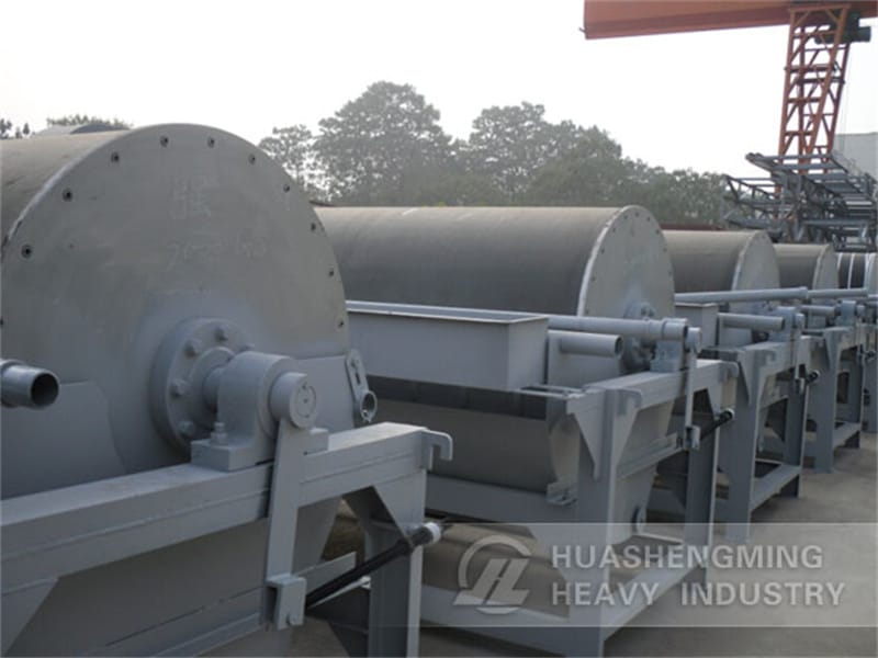 Slurry enters chute through ore tank, and then gets into separating zone by waterpower. Minerals with strong magnetism is absorbed on the barrel’s surface under the force of magnetic field and get into the ore concentrate outlet along with the rotation of cylinder. After leaving the magnetic field, they flow into ore concentrate box by the action of gravity and flushing water. Gangue and ore with weak magnetism are discharged into a pipe in the opposite direction of cylinder rotation.
