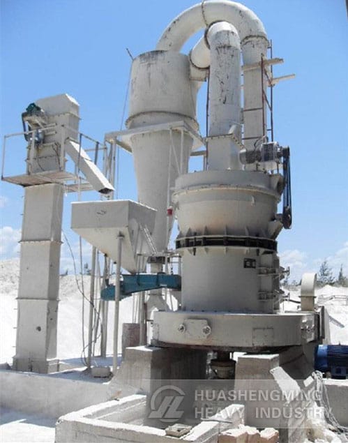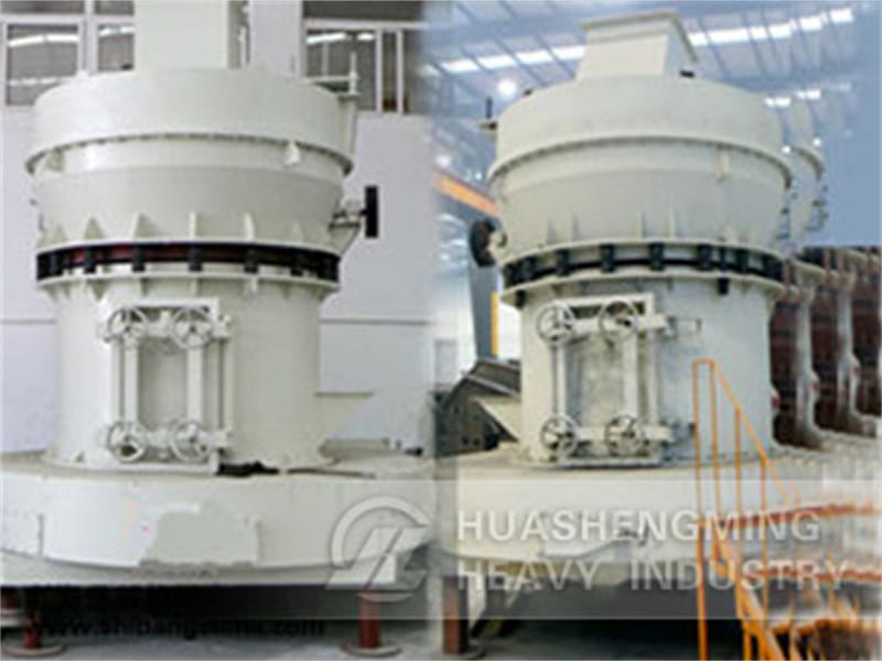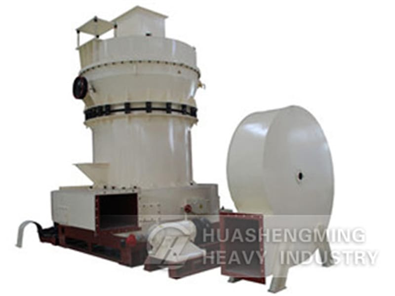 Large materials are crushed by Jaw crusher to the needed sizes firstly, then the materials are elevated to storage hopper by bucket elevator, third, the materials are fed into the grinding chamber for grinding by vibrating feeder equably and continuously. The powder after grinding goes upwards together with the airflow, after separating by powder separator, those which can meet the fineness requirement enters into the cyclone powder collector through pipe together with the airflow, and then discharged from the discharge valve as final products. The airflow is sucked into centrifugal blower through wind recycling pipe at the upper part of cyclone powder collector. The mainframe is driven by the speed reducer through the central axis in the mill. The quincunx stand connected with the upper part of central axis, at the quincunx stand, rollers are set and by which the vibrating pivot formed. Below the quincunx stand and rollers there is shovel system. Materials are fed into the space between rollers and shovels when they are turning, and then be grinded by the pressure produced when rollers are turning, thus powder is made.